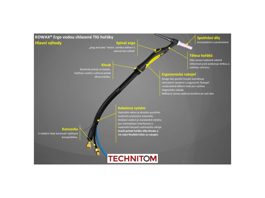- Kabelový systém poskytuje optimální výkon, který je dosažen použitím kvalitních pryžových materiálů. Ovládací vedení je standardně stíněno pro minimalizaci interferencí a maximální bezpečí svařovacího zdroje. Snazší pohyb hořáku díky kloubu a 1m dlouhé sekci z flexibilní kůže za rukojetí