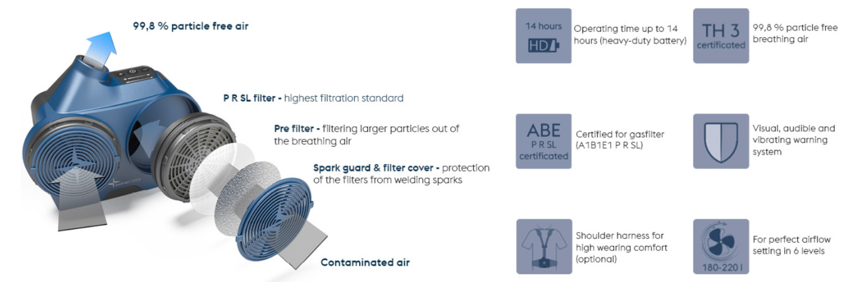 Systém je testován a certifikován podle normy EN 12941 a chrání vaše plíce filtrovaným vzduchem, který je z 99,8 % bez částic a splňuje tak nejvyšší úroveň certifikace TH3.