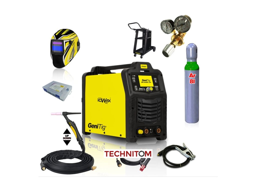 Svařovací invertor GeniTig® 220AC/DC - LCD PULZ, SYN, HF - TIG/MMA vč.3m kabelů, svorky, a drž.el. + hořák TIG26-4m UP/DOWN + kukla + vozík + lahev, atd.