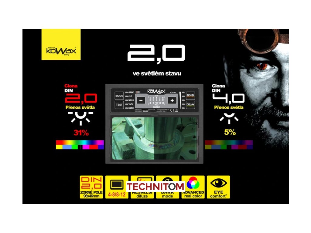 KOWAX® 2,0 - zorné pole (95 x 46,5 mm) se clonou DIN2,0 ve světlém stavu + s reálnými barvami, to je jednoznačně nejlepší volba pro všechny TIG aplikace, broušení a přesné svařování může svarek/svár produkovat. Tento čas se dá plynule regulovat v rozmezí 0,05~1s interně.