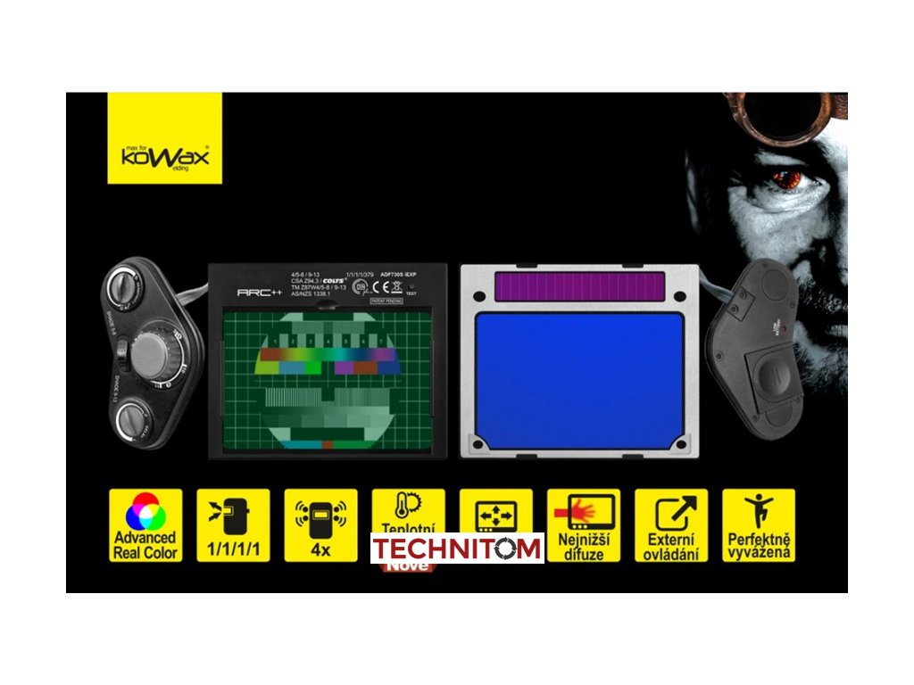 - Nejvyšší optická kvalita filtru 1/1/1/1 EN379, i v této specifikaci jsou mezi jednotlivými produkty na trhu značně rozdíly. KOWAX překonává světovou konkurenci a definuje novou úroveň optického komfortu pro svářeče díky o řád lepším výsledkům v difuzi světla přes ztmavený filtr (druhé číslo ve specifikaci dle EN379 – rozostření – viz. naznačeno zde), tato hodnota je zcela zásadní pro optický komfort při svařování. Vaše oči musí méně doostřovat, což má za následek méně unavené oči, menší sklony k bolení hlavy atd. Poznáte rozdíl.