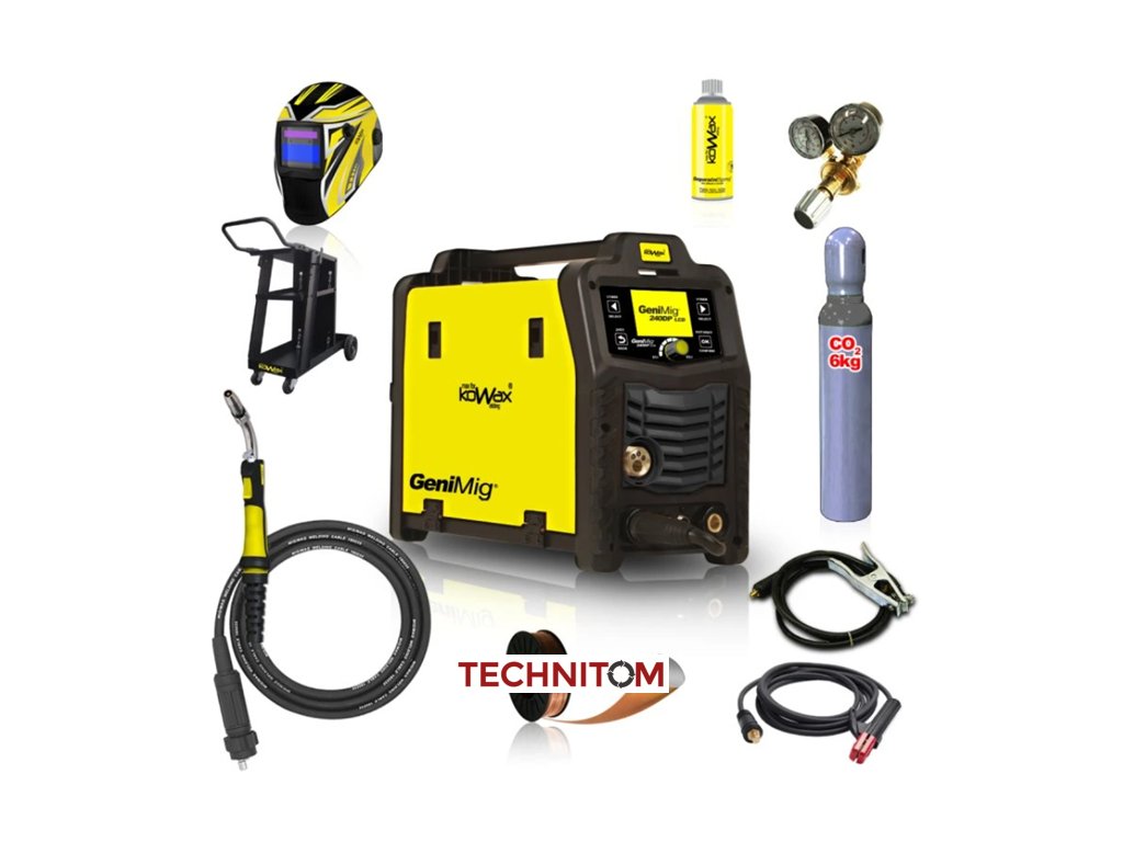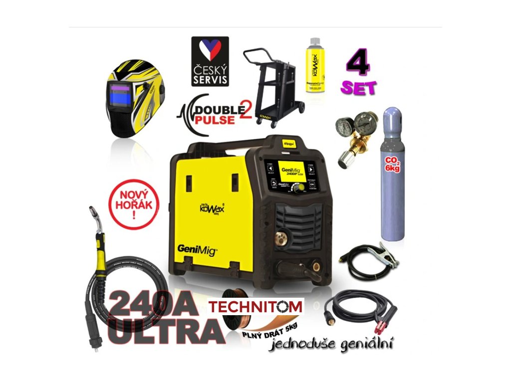 Svářecí invertor GeniMig 240DP SET4 (MIG/MAG/LiftTIG/MMA) s hořákem 240A ULTRA + kukla + red. ventil + podvozek + lahev Co2, atd.